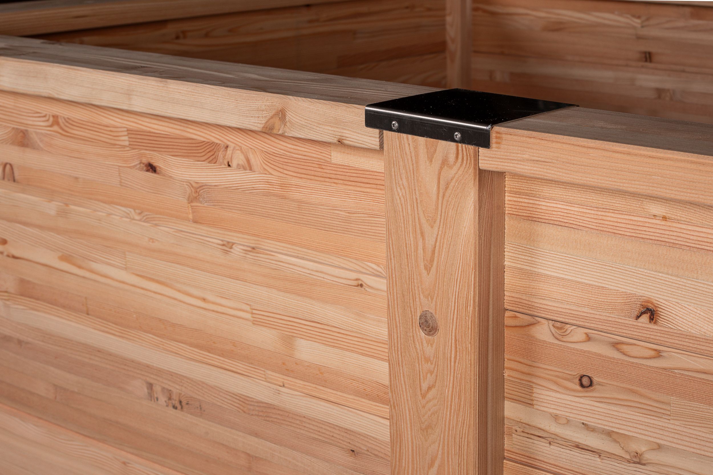 Timberra Hochbeete werden im patentierten Schwalbenschwanz-Verbundsystem gefertigt. Die statische Wandstärke beträgt 4,6 cm. Das macht das Hochbeet besonders stabil. Der Aufbau ist ähnlich einem Baukastensystem kinderleicht. Die vorgefertigten Holzelemente für die Seitenwände werden nur noch in die Steher eingeschoben, Handläufe drauf, fertig ist das Hochbeet. Die Hochbeetteile sind konstruktiv gebaut, damit das Wasser ungehindert abließen kann. Das vermeidet Staunässe und erhöht die Lebensdauer des Hochbeetes. Eine Folie ist überflüssig.